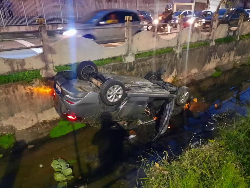 Após uma batida entre dois carros de passeio, no início da noite desta segunda-feira (10), um dos veículos parou dentro do canal na Avenida Franklin Roosevelt, no Bairro São José, em Aracaju.